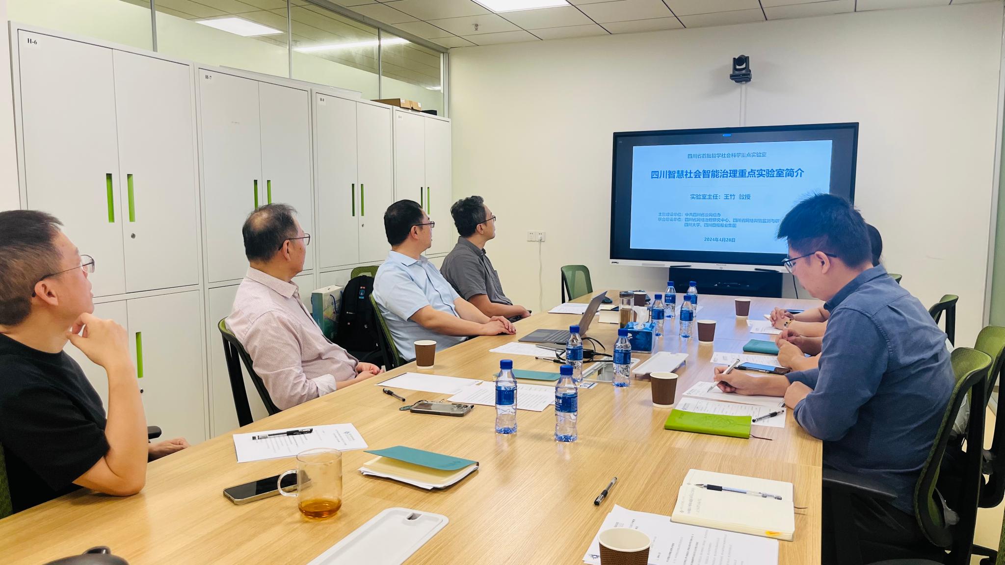 会上,王竹教授对四川智慧社会智能治理重点实验室的发展、设定目标、科研成就和运营经验进行了详细的介绍。轩辕哲教授代表重点实验室向王竹教授介绍了重点实验室的各种信息,包括科研团队的构成、成果的实现及其转化应用,以及场地的保障措施等。