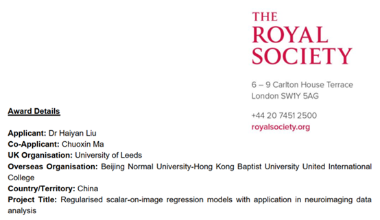 近日,由利兹大学数学学院刘海燕博士与UIC理工科技学院副教授、广东省数据科学与技术交叉应用重点实验室成员马绰欣博士共同申请的合作交流项目“Regularised scalar-on-image regression models with application in neuroimaging data analysis(正则化图像回归模型在神经影像学数据分析中的应用)”成功获得英国皇家学会的立项批准。该项目属于英国皇家学会中英国际合作交流项目,是英国皇家学会为促进中英科学家国际学术交流而设立的资助项目。